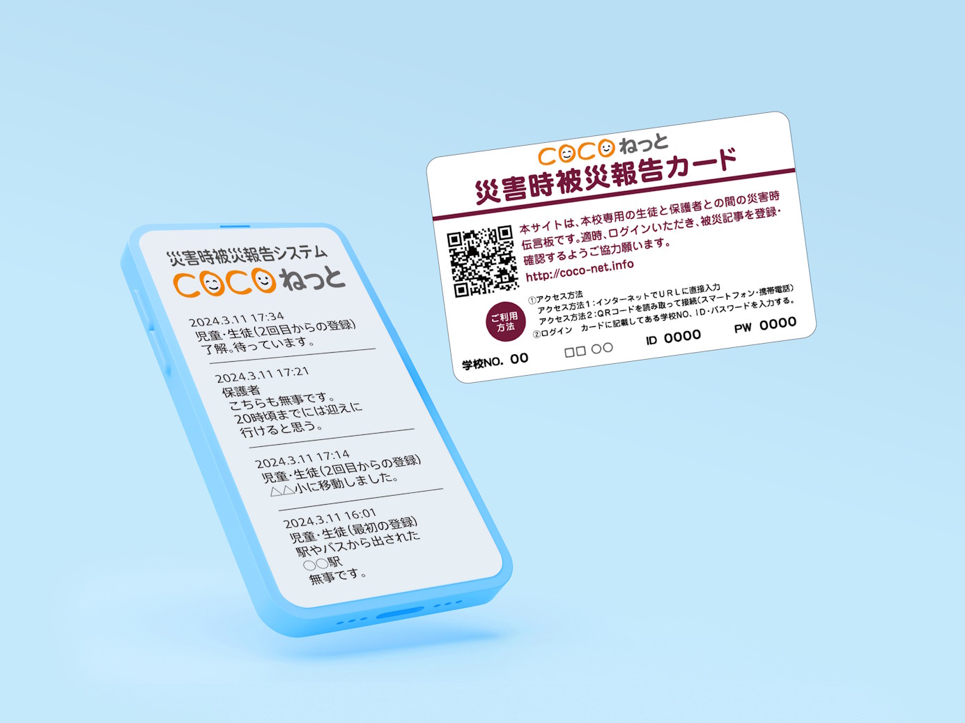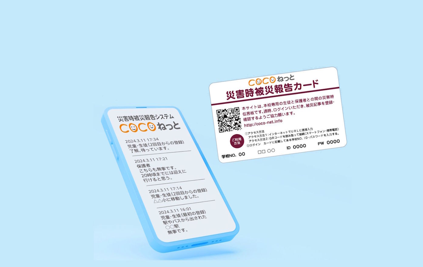 災害発生時、電話やメール、SNSなどが使えない状況下で、学校と保護者、 保護者と児童・生徒間での安否情報が確認できる、私立学校専用のネットワークです。